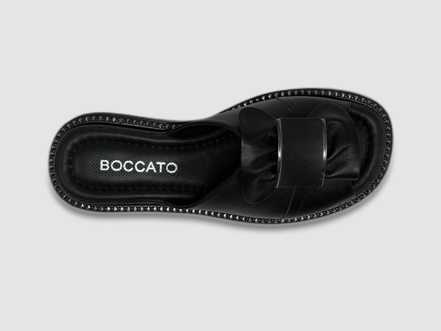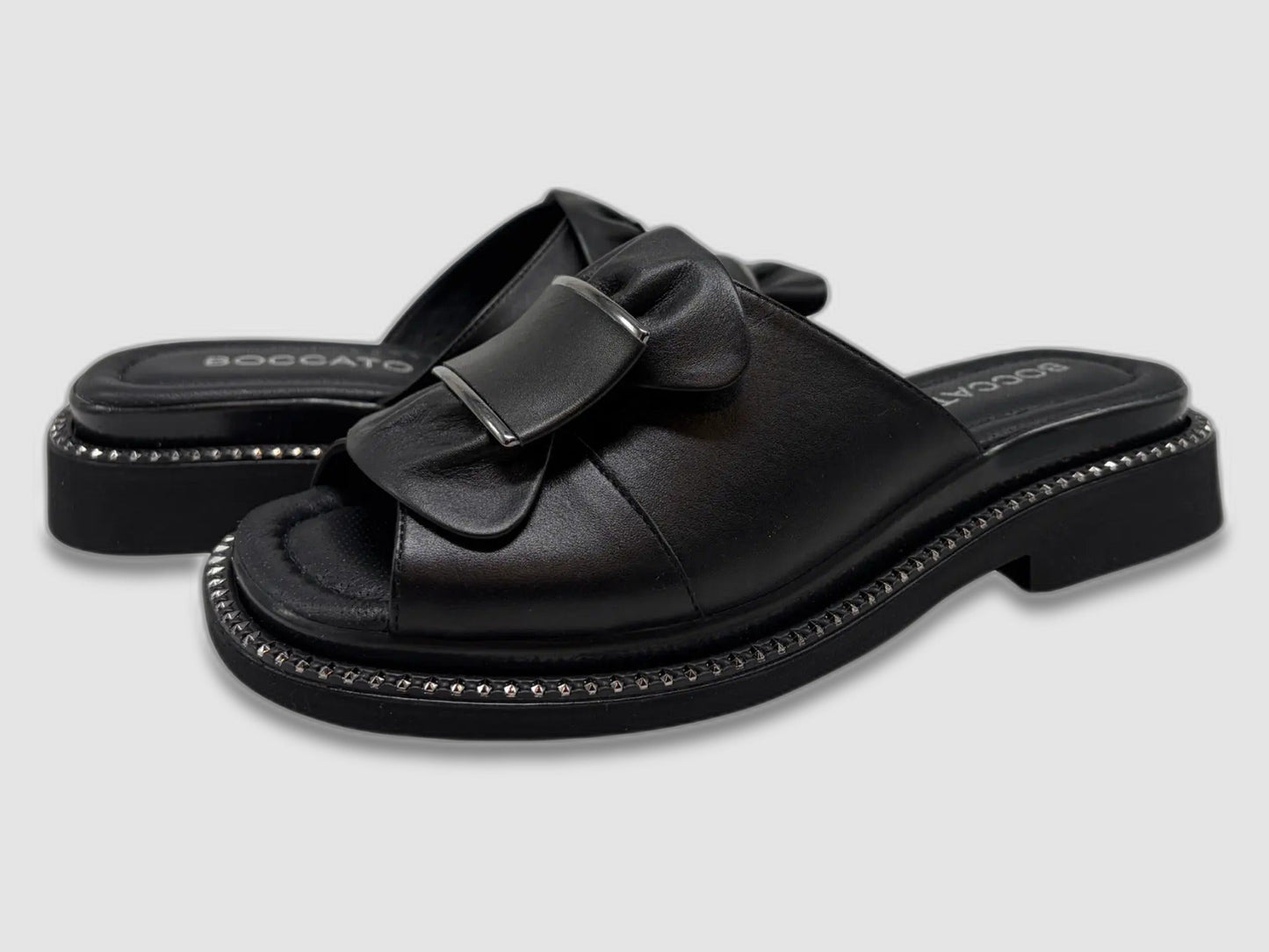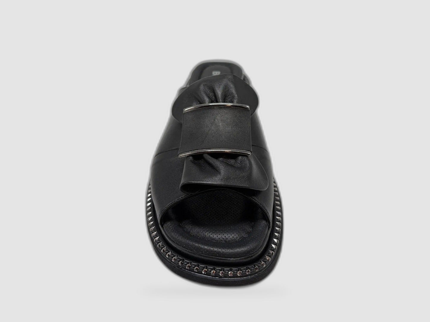 Step into everyday ease with the Women's Ixia Leather Sandals in Black by Boccato. Crafted with a soft leather upper, this slide sandal wraps your foot in comfort from the first wear. The wide strap features a bold oversized buckle with ruched leather detailing and a silver accent, giving the shoe a look that is both relaxed and polished.