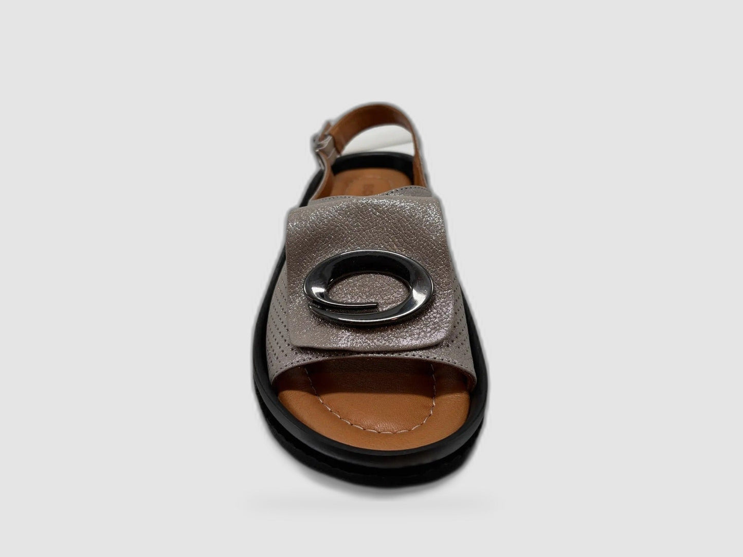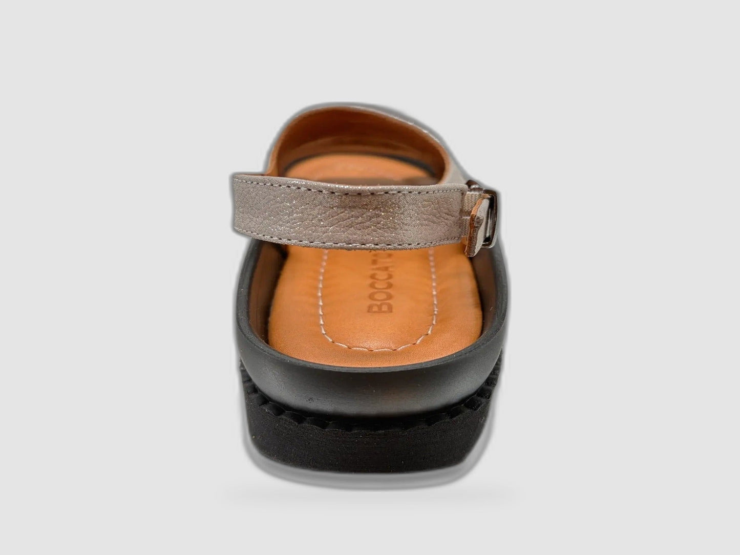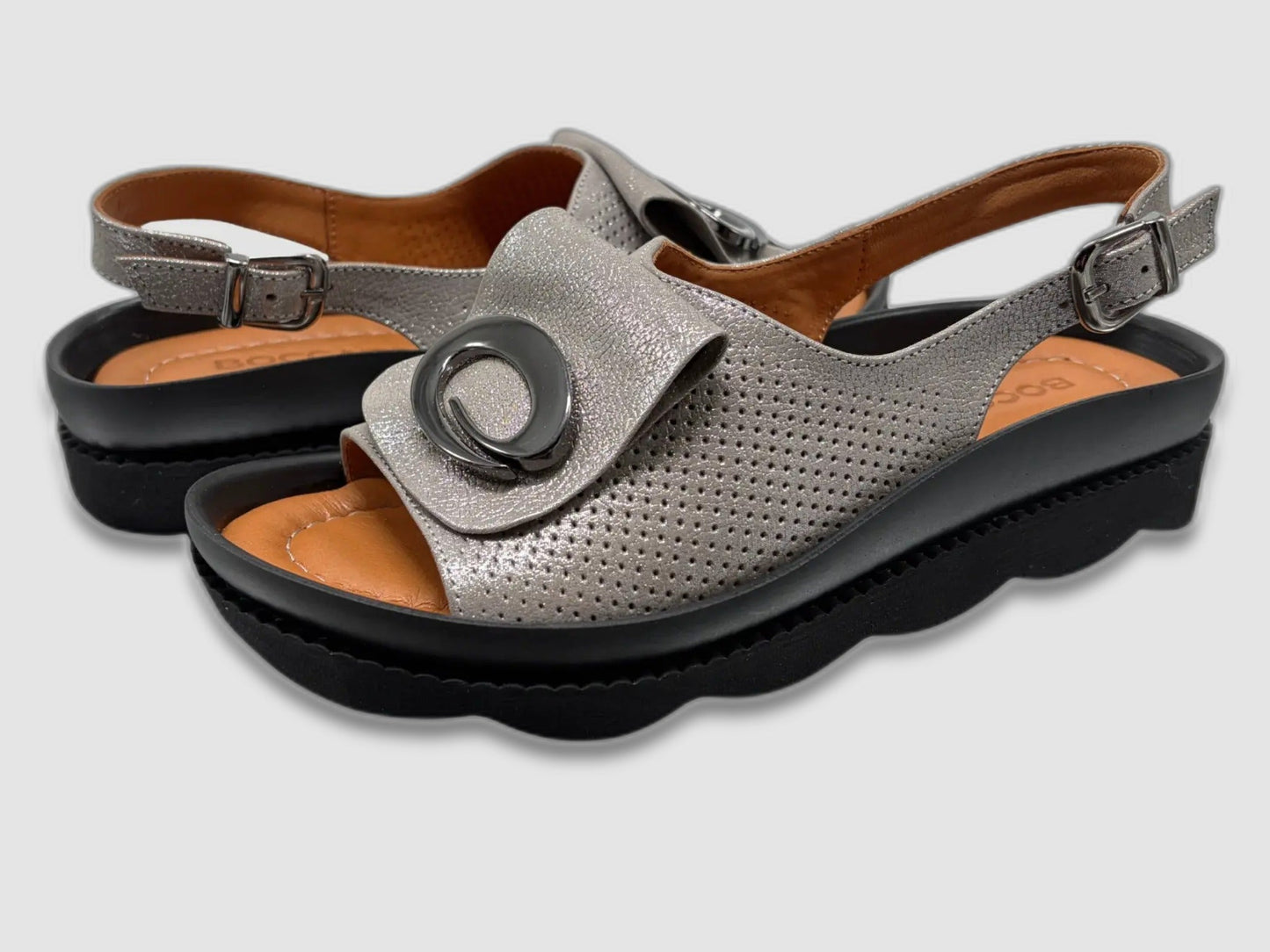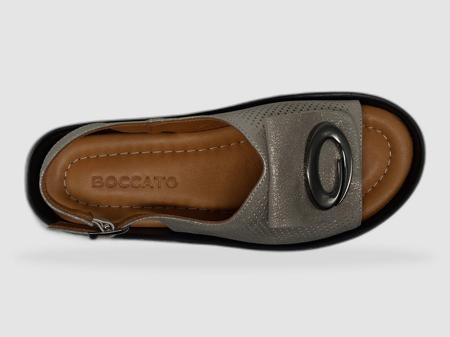 A wide toe-opening gives your feet room to breathe, while the adjustable slingback strap with a silver buckle ensures a secure and personalized fit. The standout detail is the bold circular silver hardware ornament centered on the front strap, adding a modern, fashion-forward touch that elevates even the simplest outfit. The tan leather footbed with Boccato branding provides a smooth, comfortable base underfoot.